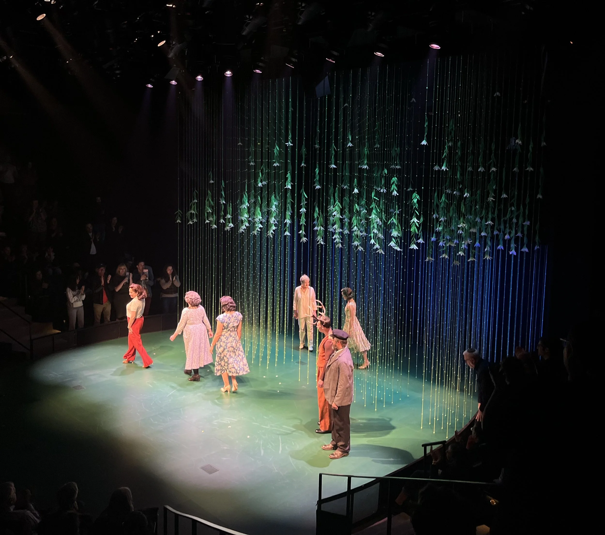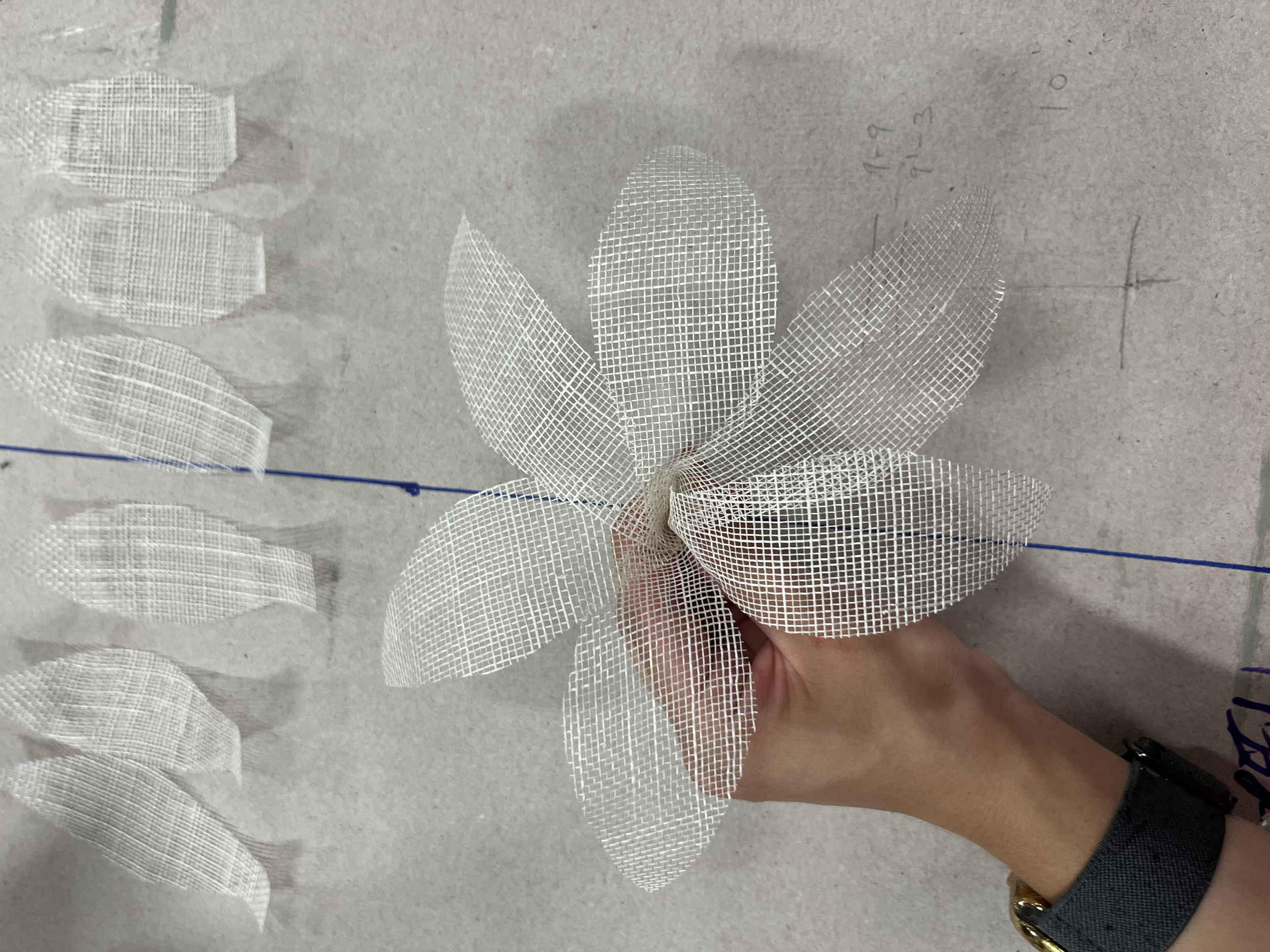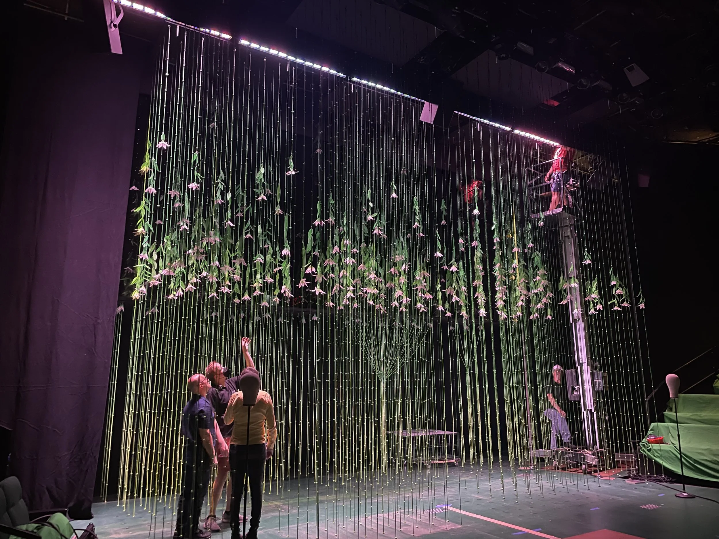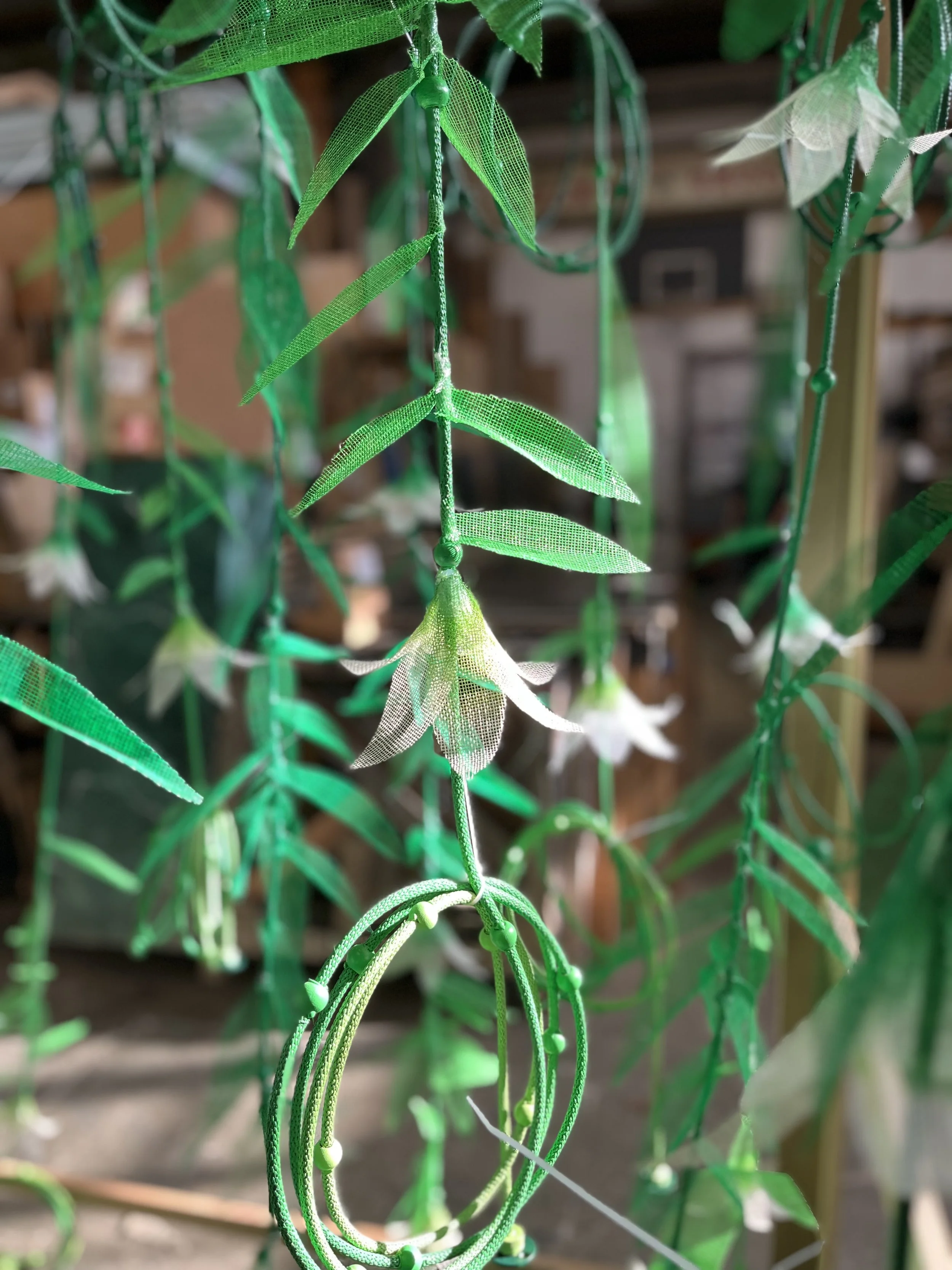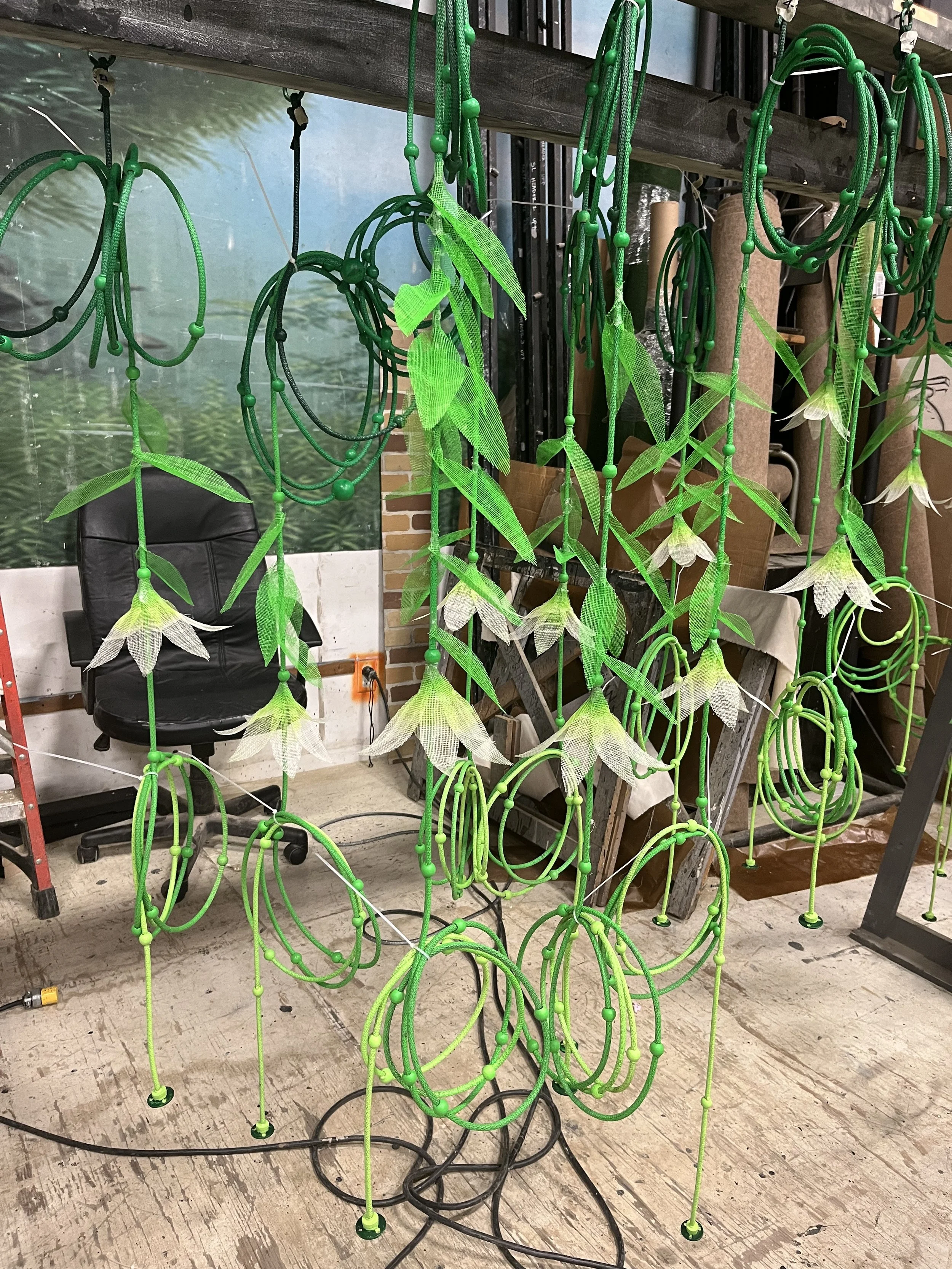 We created over 300 handmade ropes that were part of the shows scenery. The process included knotting and cutting each 22’ rope, dipping each rope in crystal gel, beading over 4,000 beads, spray painting ropes, hand cutting and painting fabric flower petals, flame retarding, and finally attaching flowers and leaves to ropes.